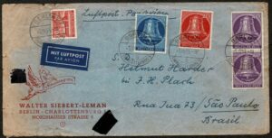 DESCRIÇÃO:Ano 1953 - Envelope aéreo circulado para São Paulo. Selos Michel 103, 104 e 105 (par) Os selos usados cotam 96 Euros...