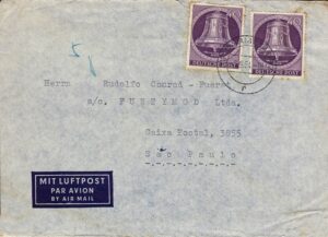DESCRIÇÃO:Ano 1954 - Envelope circulado de Darmstadt para São Paulo. 2 selos Michel 105. Peça com restrição na parte superior pontos de...