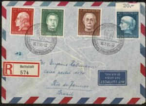 DESCRIÇÃO:Ano 1955 - Envelope registrado circulado para o Rio de Janeiro. Série completa Michel 200/203 na frente selo 210 e 2 regulares...