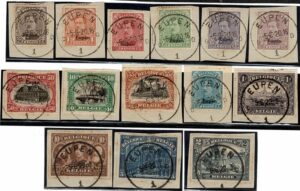 DESCRIÇÃO:◉ BÉLGICA - Eupen - 1/14 - Série, todos sobre fragmento e com o mesmo carimbo: Eupen 5.6.20. Parte com pontos de...