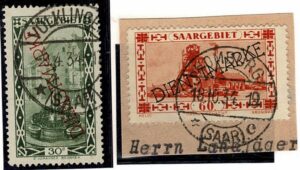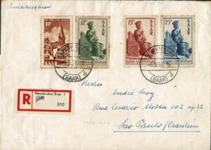 DESCRIÇÃO:SARRE - Ano 1950 - Envelope registrado circulado para São Paulo. Selos Michel 293/296 que usados cotam 60 Euros. Pontos de ferrugem...