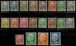 DESCRIÇÃO:** 409/428 (Presidente Heuss) - Série completa, salvo o facial de 90Fr que tem mínima mancha superior - 55 Euros....