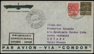 DESCRIÇÃO:CONDOR - Ano 1930 (16.9) Envelope timbrado com todos os carimbos alusivos ao 1º Voo: Corumbá/Cuyabá. Selo K1 vovó (este defeituoso)...