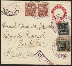 DESCRIÇÃO:Aeropostale - Ano 1929 - Inteiro Postal EN73DE (Decalque interno) selos aéreos 7 e 8 par vovó, circulado de Natal (RN) com...