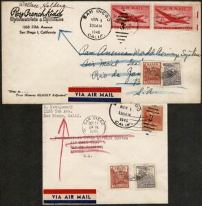 DESCRIÇÃO:Panair - Ano 1946 - 2 envelopes vindo da cidade de São Diego (USA) para o Rio de Janeiro, com 2 selos...