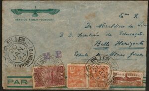 DESCRIÇÃO:Vôos Combinados - VARIG/ ? - Ano 1934 - Envelope circulado de Livramento (20.1) chegando em Porto Alegre no mesmo dia, com...