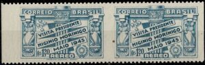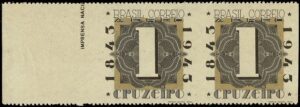 DESCRIÇÃO:** 48 - 1,00 Centenário do Selo. Par horizontal margem esquerda de folha, com variedade: Total falta do picote vertical. Filigrana horizontal...