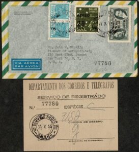 DESCRIÇÃO:Ano 1955 - Envelope registrado (com recibo anexo) circulado do Rio de Janeiro para os Estados Unidos, com chegada. Selo 45 (Estado...
