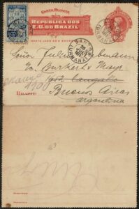DESCRIÇÃO:Ano 1911 - Carta Bilhete 100Rs + Selo 9 (Próceres Panamericanos) circulado de Santos para a Argentina, com redespacho interno.....