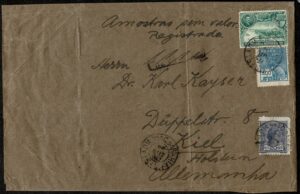 DESCRIÇÃO:Ano 1922 - Envelope com indicação "Amostra sem valor - registrada" circulado da Bahia para a Alemanha, com chegada. Selo 16 (300Rs...