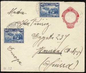 DESCRIÇÃO:Ano 1923 - Inteiro tipo EN (200Rs) 2 selos 14 (100Rs Independencia) circulado de S.Paulo para a Suiça, com chegada......