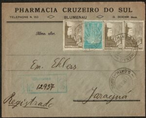 DESCRIÇÃO:Ano 1930 - Envelope registrado circulado de Blumenau (carimbo verde) para Jaragua, com chegada. Selos 100rs e 200Rs x 3 (série arquitetos)...