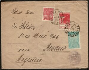 DESCRIÇÃO:Ano 1930 - Envelope registrado circulado de Cruz Alta para a Argentina, com carimbo de transito chegada. Selos 24 e 26 (100Rs...