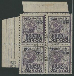 DESCRIÇÃO:◉ 157A - Governo Getulio Vargas - Quadra com a filigrana M e carimbo comum. Pouco usual - 420 UF...