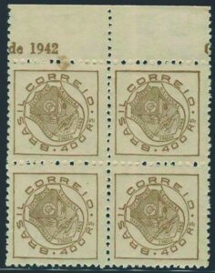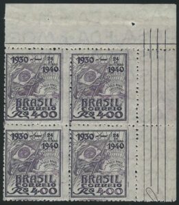 DESCRIÇÃO:* 157A - Decenio Governo Getúlio Vargas - Filigrana M - Quadra canto superior de folha - Bem limpos - 640 UF...