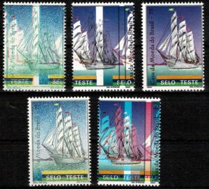 DESCRIÇÃO:** SELO TESTE - Figurando Caravela, indicação Casa da Moeda do Brasil. Provável ajuste de máquina. Trinca horizontal com variedade: Impresso nos...
