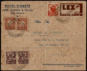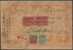 DESCRIÇÃO:Ano 1934 - Envelope registrado com porte de 5.600 Réis (4.200 Réis do 5º Grupo + 1.400 Réis do registro aéreo) circulado...