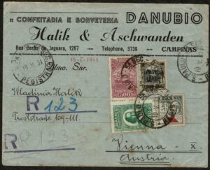 DESCRIÇÃO:Ano 1931 - Envelope timbrado de empresa de Campinas (SP) registrado, circulado de São Paulo para a Austria. 3 selos aéreos 2$000...