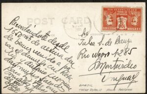 DESCRIÇÃO:Ano 1931 - Cartão Postal tipo fotográfico (Theresópolis) circulado para o Uruguai. Selo 30 (100Rs Revolução de 30) afixado de ponta cabeça...