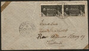 DESCRIÇÃO:Ano 1932 - Envelope circulado dentro do Espirito Santo com chegada. Par selo 42 (100Rs S. Vicente) Durex em 2 cantos da...