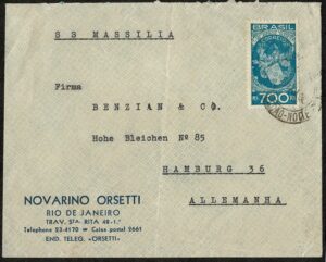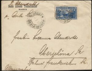 DESCRIÇÃO:Ano 1933 - Envelope circulado da Bahia para a Alemanha. Franquia isolada selo 45 (São Vicente) - 130 UF...