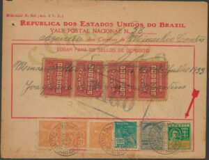 DESCRIÇÃO:Ano 1933 - Vale de Depósito no valor de 1 conto de Réis, com carimbo de Maroim (SE) - 4 selos vovó...