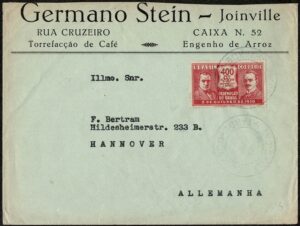 DESCRIÇÃO:Ano 193 ? - Envelope timbrado circulado de Joinville para a Alemanha. Selo 33 (400Rs Revolução de 30) em franquia isolada. Não...
