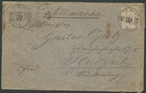 DESCRIÇÃO:Ano 1889 - Envelope circulado de Santos para a Alemanha, com 2 diferentes carimbos de transito no Rio de Janeiro chegada. 2...