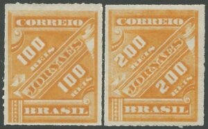 DESCRIÇÃO:*/(*) (19) e (21) - 10 e 100 Réis - Ambos sem picote. Provas ? Cor definitiva e papel do selo. O...
