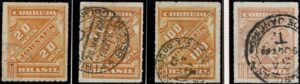 DESCRIÇÃO:* 20 - 20Rs - Quadra com reforço. 2 selos com adelgaçamento e 2 com picote falho - 900 UF...