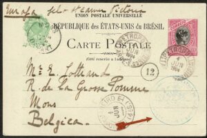 DESCRIÇÃO:57C - 100Rs - Ano 1904 - Circulado de Petrópolis para a Bélgica, com trânsito mais chegada. Carimbo frontal da "legação Belga...