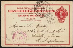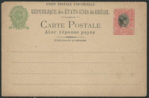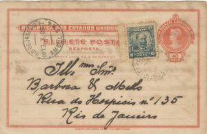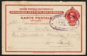 DESCRIÇÃO:74R - 100Rs - Ano 1918 - Resposta usada com pergunta, circulado de São Benedito (CE) para os Estados Unidos, com carimbo...