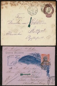DESCRIÇÃO:Anos 1896 e 1897 - 2 Inteiros Postais com destino Alemanha: Ano 1896, de Santos com carimbo octogonal Ligne J, Paq Fr...