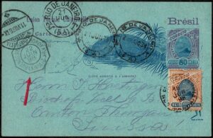 DESCRIÇÃO:Ano 1898 - Inteiro Postal tipo BP selo madrugada 20Rs, circulado de Santa Catarina para a Suiça, com 3 carimbos de transito...