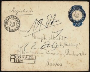 DESCRIÇÃO:Ano 1907 - Inteiro Postal EN 52 (500RS) registrado, enviado do Rio de Janeiro para o Capitão Muhle do navio S.S. Koblenz,...
