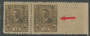 DESCRIÇÃO:** 30 - 10Rs Wenceslau Braz - Par horizontal, ficando o selo direito sem o picote vertical. Margem de folha e segundo...