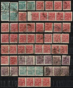 DESCRIÇÃO:◉ 188/190 (antiga numeração) Filigrana Linha vertical - "Estoque" com 37 selos, assim distribuído pelos faciais: 50Rs x 6, 100Rs x 25...