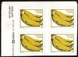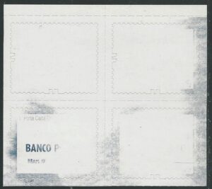 DESCRIÇÃO:** 750B4A - 0,02 Banana - Quadra canto superior esquerdo de folha, com "Correio" impresso no verso dos selos - 360 UF....
