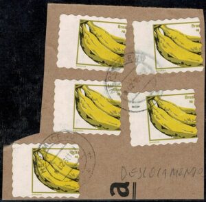 DESCRIÇÃO:◉ 779 - 0,02 Banana - Fragmento com 5 selos com grande deslocamento vertical do corte de destaque dos selos....