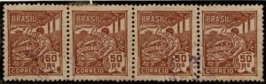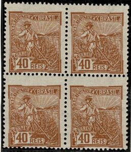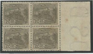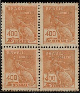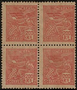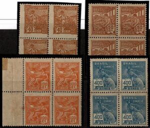 DESCRIÇÃO:** 230/230vA - 40Rs Agricultura - Quadra, ficando 3 selos normais e 1 com a variedade Cruzeta - 96 UF...