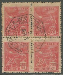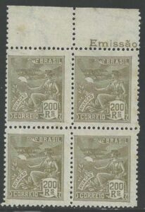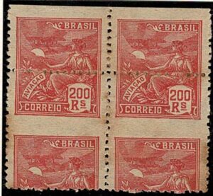 DESCRIÇÃO:* 214 - 200Rs Aviação - Filigrana "E" - Quadra em papel bem escuro, tipo Palha ? Bem diferente dos demais selos...