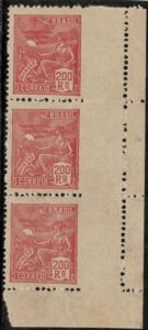 DESCRIÇÃO:** 214 - 200Rs Aviação - Trinca vertical, com grande margem no lado direito - Selos tipo cotam 112 UF...