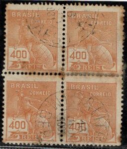 DESCRIÇÃO:◉ 247Es - 400Rs mercúrio - Quadra, ficando os 2 selos da esquerda sem filigrana. Carimbo Salitre (MG) Pontos de ferrugem -...