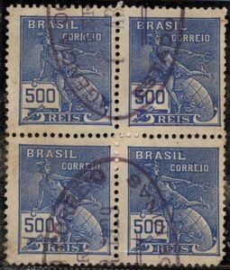 DESCRIÇÃO:* 248BEs - 500Rs Mercúrio - Quadra, ficando 2 selos com e 2 selos sem filigrana - 600 UF...