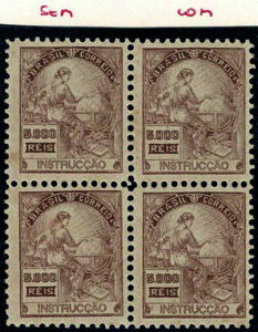 DESCRIÇÃO:* 208h/Es (ano 1995) - 5.000Rs Instrucção - Quadra, 2 selos com e 2 selos sem filigrana. O selo sem filigrana marca...
