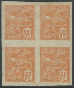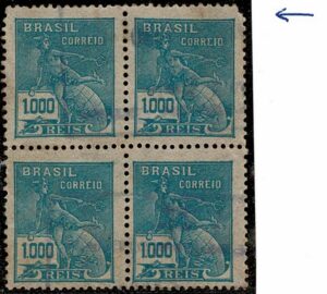 DESCRIÇÃO:◉ 251Es - 1$000 Mercúrio - Quadra, ficando os 2 selos superiores sem filigrana (o da direita com canto superior defeituoso) 90...
