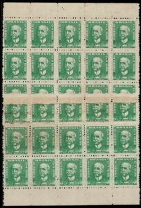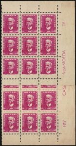 DESCRIÇÃO:(*) 502 - 5,00 Rui - Bloco de 15 selos vertical, com emenda de bobina horizontal na 3ª fileira.....