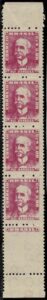 DESCRIÇÃO:** 502 - 5,00 Rui - Tira de 5 vertical, com impressão bem parcial no ultimo selo....