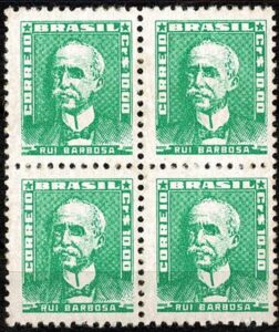 DESCRIÇÃO:* 514Y - 10,00 Rui Barbosa - Quadra em papel marmorizado. Aderência traseira nos 2 selos inferiores - 216 UF...
