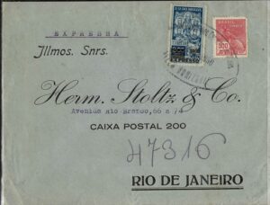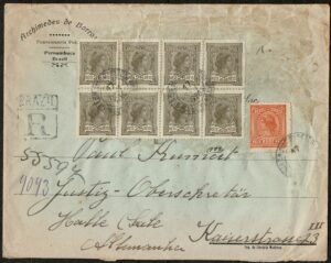 DESCRIÇÃO:Ano 1920 - Envelope timbrado, registrado circulado de Pernambuco para a Alemanha, com chegada. 500Rs de porte nos selos alegoria : 300Rs...